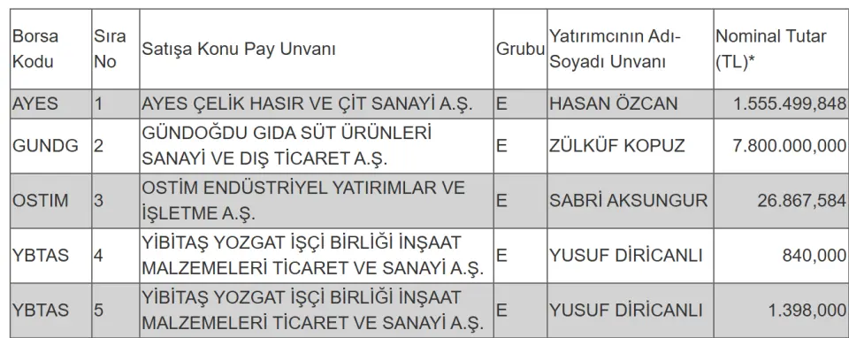 Bu işleme konu olan bir şirket oldu. Bu şirket, GÜNDOĞDU GIDA SÜT ÜRÜNLERİ SANAYİ VE DIŞ TİCARET A.Ş. olurken, çeşitli yatırımcılar E tipi işlem görmeyen paylarının bir miktarını borsada işlem gören tipe dönüştürmek için başvuru yaptı.
