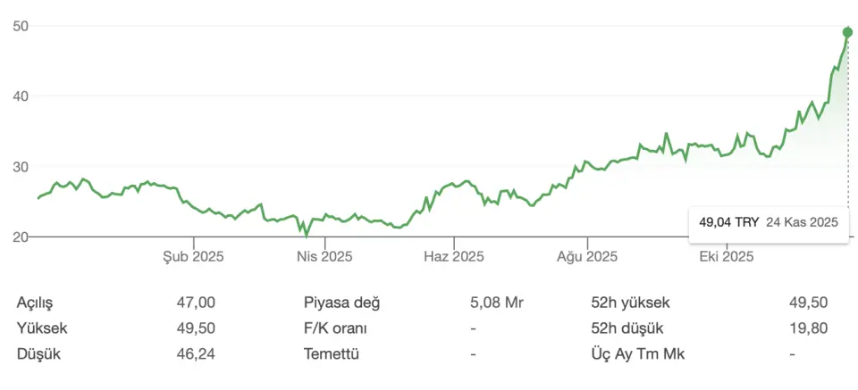 24 Kasım 2025 tarihine 46,60 TL'den başlangıç yapan OZYSR hissesi, saat 14.30 itibariyle %5,14 değerlendi. 49,16 TL'den işlem gören hisse, geçtiğimiz hafta da %11,73 değer kazanmıştı. Son 1 ayda %47,98 değerlenen OZYSR, 6 ayda yatırımcısına %88,93 kazandırdı. OZYSR hissesi son 1 senede de %93,70 değer kazandı. Hissesi değerlenen şirket, güçlü ihracat performansı ile de dikkat çekiyor.
