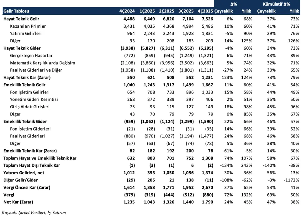 - "Hayat segmentinin teknik marjı, hayat segmenti teknik karın kazanılmış primlere bölünmesi, şirketin primleri ne kadar verimli teknik kara dönüştürdüğünü gösteriyor. Bu oran 4Ç25’te %22’ye yükseldi (3Ç25: %11)."