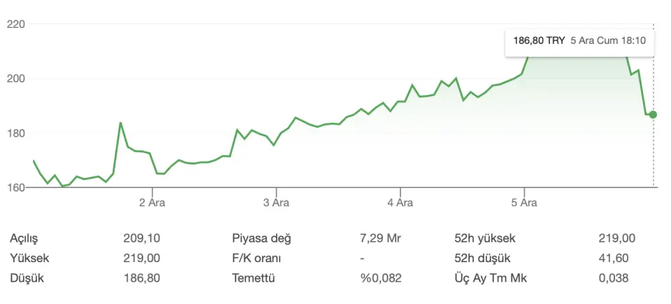 Geçtiğimiz haftalarda gösterdiği performansla dikkatleri üzerine çeken hisse son işlem günündeki sert düşüşle yatırımcısını kayba uğrattı. 2025 başında 53,10 TL olan ve 218 TL'leri gören hissede son durum takip ediliyor.