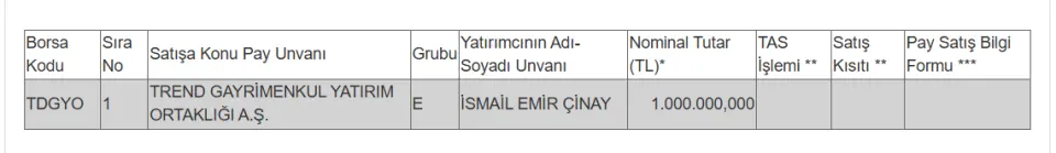 Bu işleme konu olan bir şirket oldu. Bu şirket, TREND GAYRİMENKUL YATIRIM ORTAKLIĞI A.Ş..olurken, çeşitli yatırımcılar E tipi işlem görmeyen paylarının bir miktarını borsada işlem gören tipe dönüştürmek için başvuru yaptı.