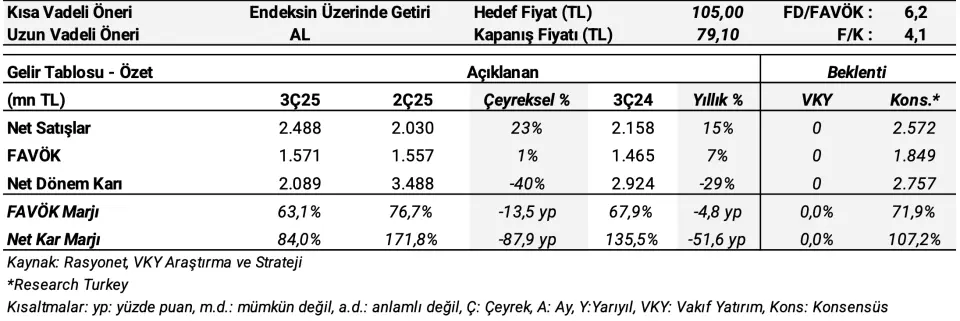 - "FAVÖK marjı yıllık bazda 4,8 puan daraldı- Şirket’in FAVÖK’ü, bu çeyrekte yıllık %7,2 yükselerek 1,57 mlr TL’ye ulaşırken, yılın ilk dokuz ayında yıllık %5,1 artarak 4,55 mlr TL’ye yükseldi. 2Ç25 döneminde %76,7 olan FAVÖK marjı bu çeyrekte 13,5 puan azalarak %63,1 (3Ç24: %67,9) seviyesinde gerçekleşti."
