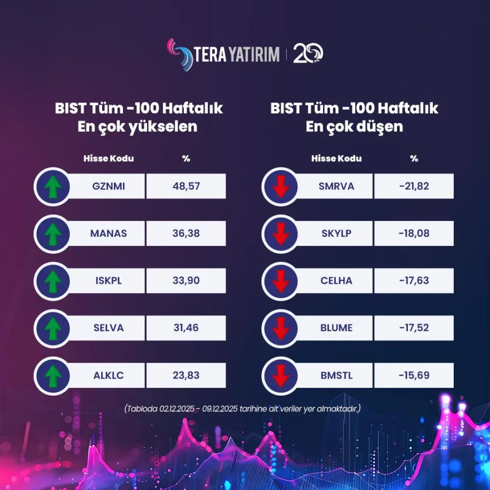 GZNMI %48,57 kazandırırken en çok kaybettiren hisse hangisi? Tera Yatırım, haftalık BİST 100 endeksi hisse performanslarını analiz etti. En fazla kazandıranlar ve kaybettirenler belli oldu.