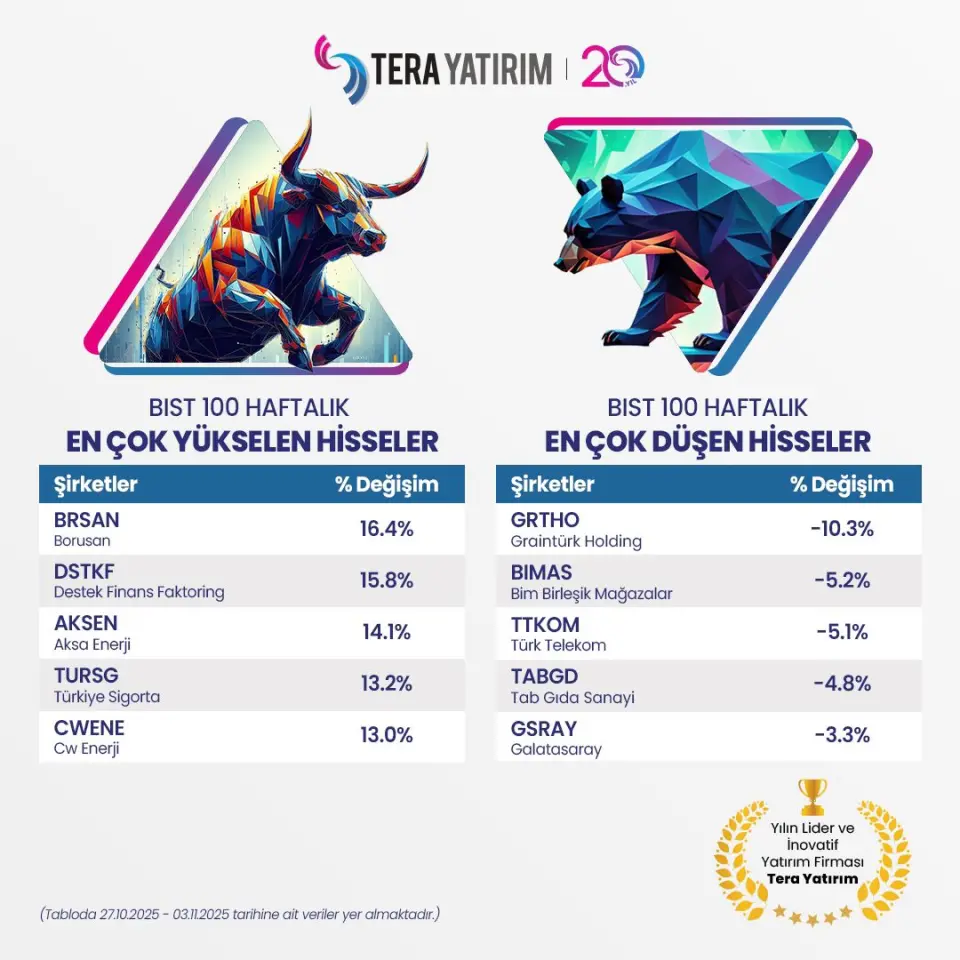Borsa aracı kurumu Tera Yatırım, BIST 100 endeksinde en çok yükselen ve düşen hisseleri haftalık olarak açıklamaya devam ediyor. Tera Yatırım, Borsa İstanbul yatırımcıları için sosyal medya aracılığı ile bu hisseler paylaşılıyor. Tera Yatırım'ın paylaşımında "BIST 100 Haftalık en çok düşen ve en çok yükselen hisseleri takip ederek yatırım stratejinizi belirleyebilirsiniz." şeklinde bir ibareye yer verildi.