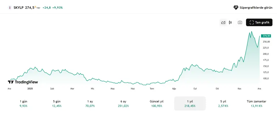 Hisse senedinin son dönem performansına bakıldığında dikkat çekici bir tablo ortaya çıkıyor. Skyalp, son 6 ay içerisinde yaklaşık yüzde 251 oranında getiriyi yatırımcısına sağlamayı başardı. Bu performans, yatırımcısının portföy değerinin bu süreçte yaklaşık üç buçuk katına çıkması anlamına geliyor. Hisse senedinin kısa vadeli hareketlerinde de benzer bir görünüm mevcut. Şirket son bir ayda yüzde 70 oranında değer kazandı. Bugünkü işlem gününde ise Skyalp hissesi yüzde 10 yükselişle başladı ve fiyat 274 TL seviyesine kadar ulaştı.