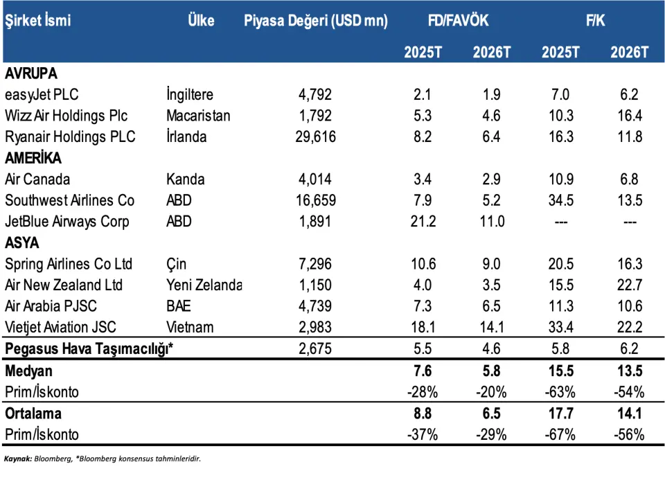 - "Pegasus Hava Taşımacılığı’nı küresel benzerleri ile karşılaştırdığımızda, Bloomberg tahminlerine göre şirket 5,5x olan 2025T FD/FAVÖK çarpanına göre %28, 4,6x seviyesindeki 2026T FD/FAVÖK çarpanına göre de %20 iskontolu işlem görmektedir. F/K çarpanları cephesinde de 5,8x olan 2025T F/K çarpanına göre %63, 6,2x seviyesindeki 2026T F/K çarpanına göre %54 iskonto sunmaktadır."