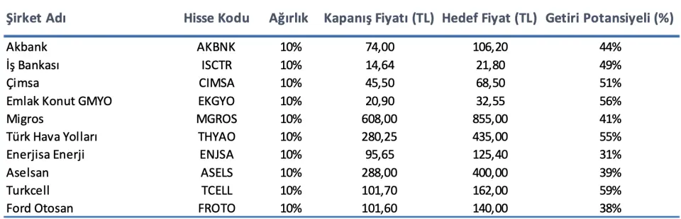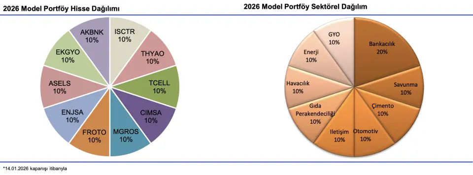 - "Model Portföyümüzde öne çıkardığımız şirketlere geçecek olursak; bankacılık sektöründe, 2026’da Akbank ve İş Bankası, banka dışı tarafta ise Aselsan, Turkcell, Emlak Konut GYO, Çimsa, Migros, Enerjisa Enerji, Türk Hava Yolları, Ford Otomotiv yer alıyor. Güçlü pazar payı kazanımı ve sağlam bilanço yönetimiyle ön planda kalmaya devam edecek olan Akbank (AKBNK); güçlü bilanço kompozisyonu ve vade uyumsuzluğunu kendi lehine çevirebilme kapasitesi ile faiz indirim döngüsünden en fazla faydayı sağlayacağını düşündüğümüz İş Bankası (ISCTR); artan faturalı abone bazı ve devam edeceğini öngördüğümüz reel ARPU artışının operasyonel karlılık üzerindeki pozitif etkisine ek olarak, devam eden yatırımlar ve 5G lisans ödemelerine karşın, borçluluğunun yönetilebilir seviyelerde kalacağını tahmin ettiğimiz Turkcell (TCELL); oyun değiştirici temaya sahip yeni projelere ek olarak, uluslararası müşterilerle imzalanan ihracat sözleşmelerinin karlılıktaki yansımalarıyla ön planda kalacak olan Aselsan (ASELS); küresel talebin zayıf olduğu dönemlerde dahi marjlarını korumayı başaran şirketin, ihracatçı yapısı nedeniyle globalde faiz indirim döngüsünün başlamasıyla, rakiplerine göre olumlu ayrışacağını düşündüğümüz Çimsa (CIMSA); faiz indirim sürecinin de önemli desteğiyle, 2026’da inşaat aktivitesinde bir toparlanma öngörümüz ve hızlanan kentsel dönüşüm hareketinin de desteğiyle satışlara katkı sağlayacağını beklediğimiz Emlak Konut GYO (EKGYO); faiz oranlarındaki düşüşün işletme sermayesi finansman baskısını daha da azaltarak serbest nakit akımı üretimini ve değerleme görünümünü destekleyebileceği beklentisi ile Migros (MGROS); dağıtım ve perakende segmentlerinde sahip olunan güçlü konum, regüle yapının sunduğu öngörülebilirlik ve yeni düzenleyici dönemde artan WACC ile desteklenen karlılık görünümü ile Enerjisa Enerji (ENJSA); kapasite büyümesi ve yolcu artışının sürmesi, stratejik adımlarla genişleyen uçuş ağı, coğrafi konum avantajı ve güçlü transfer trafiği ile Türk Hava Yolları (THYAO); VW anlaşması ve verimliliği yükselecek modelleriyle ihracat performansını genişletmesini beklediğimiz Ford Otomotiv (FROTO) hisselerini öne çıkarıyoruz."