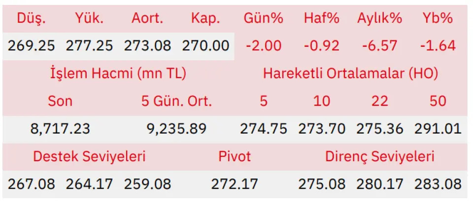 Gün içinde en düşük 269.25 en yüksek 277.25 seviyesini gören Türk Hava Yolları hissesinin günü %2.00 kayıpla tamamladığı gözlenmektedir. Pivot seviye 272.17 seviyesinden geçmekte olup, aşağı yönlü hareketlerde birinci destek 267.08, ikinci destek ise 264.17 seviyesinden geçmektedir. Dirençler ise sırasıyla 275.08, 280.17 seviyelerinden geçmektedir. Bu aşamada endeksin 5 günlük HO seviyesinin %1.73 altında, 22 günlük HO seviyesinin ise %1.95 altında hareket ettiği dikkat çekmektedir. Son gün işlem hacmi ise bu aşamada 5 günlük ortalama işlem hacminin % 5.62 altında gerçekleşmiştir.