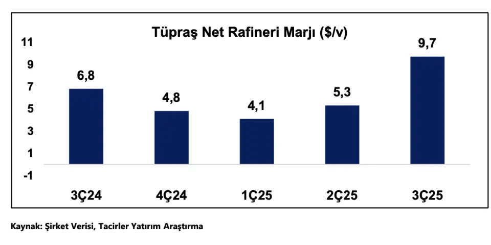 - "Tüpraş Ağırlıklı Ürün Marjı ($/varil). Tüpraş, 2025 yılı için enflasyon muhasebesine tabi tüm etkilerden arındırılmış net rafineri marjı beklentisini önce 5 – 6 $/varil olarak paylaşmıştı. Ancak 3Ç25 finansalları sonrasında bu beklenti 6,0 – 6,5 $/varil aralığına revize edildi. Şirket 1Ç25’te 4,1 $/varil, 2Ç25’te ise 5,3 $/varil net rafineri marjı açıklamıştı. 3Ç25’te 9,7 $/varil olarak gerçekleşti."