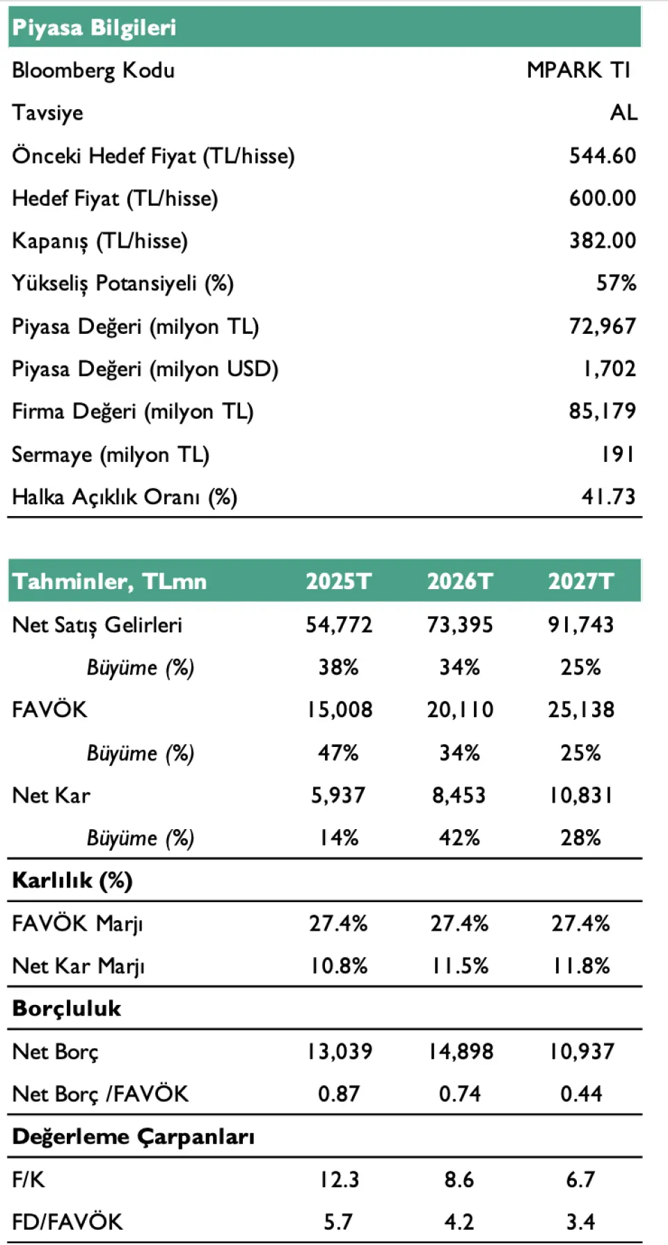 Kuveyt Türk, MPARK hissesi için 544,6 TL olan hedef fiyatını 600 TL’ye yükseltti. MPARK hisse tavsiyesi de AL şeklinde sunuldu. MPARK hissesinin yükseliş potansiyeli de %57 olarak açıklandı.