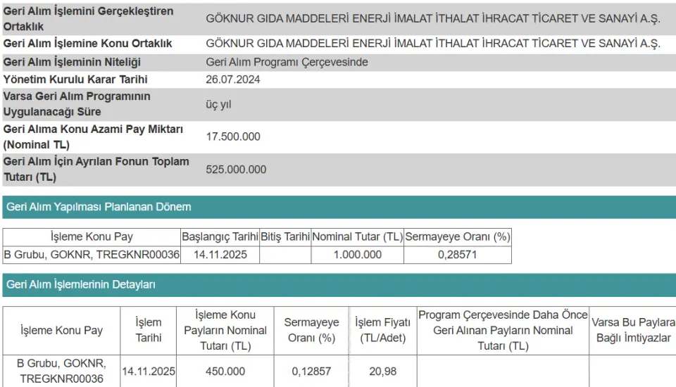 26.07.2024 tarihli Genel Kurul kararı ile onaylanan Pay Geri Alım Programı'na istinaden 14.11.2025 tarihinde yapılan alım işlemi tabloda gösterilmiştir.