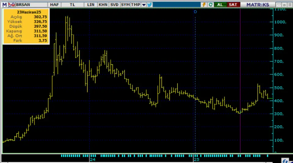 BRSAN borsada ne yazık ki düştükçe düşen hisselerden. Hisse, Ekim 2023 günü gördüğü 1044 Lira zirve fiyata hala oldukça uzak. BRSAN bu günlerde 400-500 Lira fiyat aralığında işlem görüyor ve hisse en düşük fiyat olarak Haziran ayında 297 Lira görmüştü.