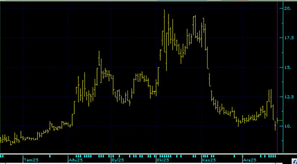 Hisse, zirve fiyattan düşüşe başladı ve yüksek hızla 9,62 TL fiyata kadar değer kaybetti.Şirket son günlerde de elinde kalan son payları da satmaya devam ediyor. En son 2.041.614 lot hisse 10,53 - 11,33 TL fiyattan satıldığı duyuruldu. Şirket satmaya devam ettikçe hisse de değer kaybetmeye devam ediyor.