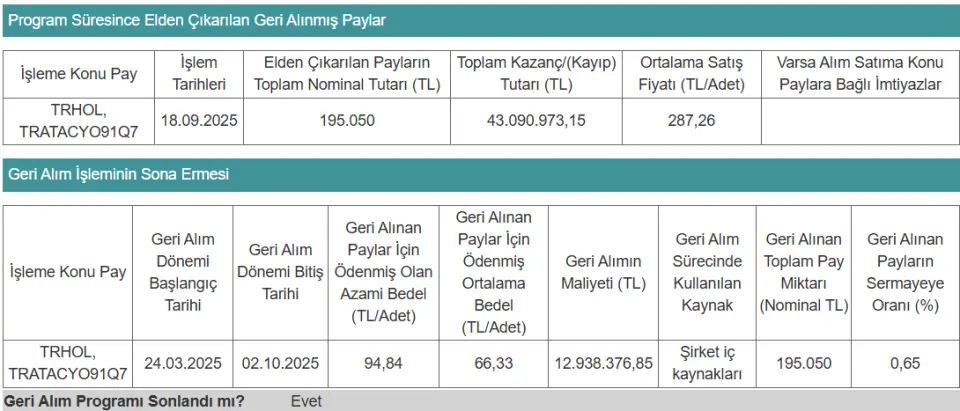 Gelinen noktada piyasa koşullarındaki normalleşme ve pay fiyatındaki dengelenmenin sağlanmasıyla birlikte geri alım programının hedeflerine büyük ölçüde ulaşıldığı değerlendirilmiş olup Şirketimiz yönetim kurulunun 02.10.2025 tarihli kararı uyarınca Şirketimizin uzun vadeli büyüme ve yatırım stratejilerine odaklanabilmesi amacıyla, mevcut geri alım programının sonlandırılmasına karar verilmiştir.