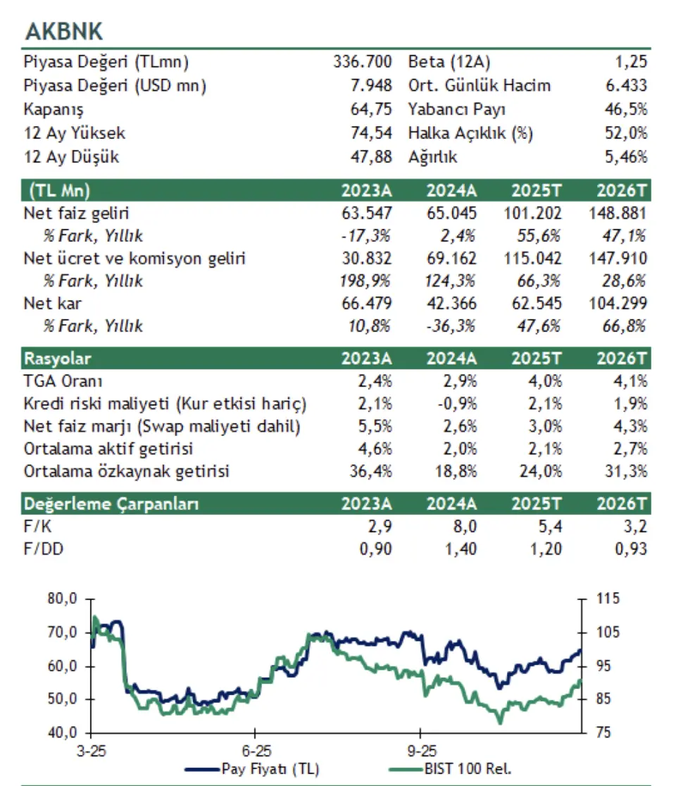 - "Bankanın net karının 2025'te 2024 yılına oranla %47 oranında artmasını bekliyoruz. AKBNK hissesi için 88,90 TL olan hedef fiyatımızın %37 getiri potansiyeli bulunmaktadır. AKBNK hissesi şimdilerde 66,05 TL'den işlem görüyor. Banka payları 2025T 5,4 x F/K ve 1,20 x F/DD çarpanlarıyla ve %24 ortalama özkaynak karlılığı ile işlem görmektedir."