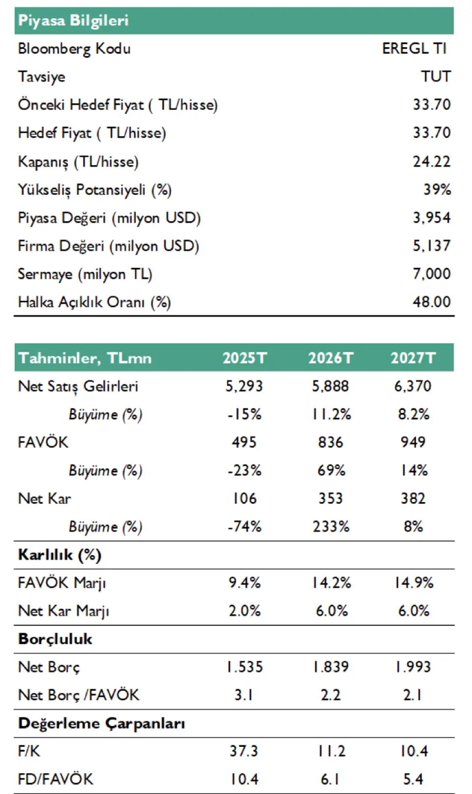 - "Ereğli için, demir-çelik sektöründe toparlanmanın beklenenden daha yavaş ilerlemesi ve risk-getiri dengesini göz önünde bulundurarak hisseyi model portföyümüzden çıkartırken, 12 aylık 33,70 TL hedef fiyatımızı ve “TUT” yönündeki tavsiyemizi koruyoruz."
