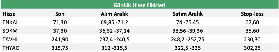 Destek Yatırım'ın günlük hisse fikirleri arasında ENKAI, SOKM, TAVHL ve THYAO hisseleri yer aldı. Aracı kurum, "Üçüncü çeyrekte yolcu büyümesi ve mevsimsellik etkisi sebebi ile Tav Havalimanları ve Türk Havayolları’nı, Ortadoğu’da yeni iş almapotansiyeli ve finansal yatırımlarının bu çeyrekte katkı beklememiz sebebi ile Enka İnşaat’ı, son iki ayda işlenmemiş gıda fiyatlarının manşet fiyatlarını aşacak olması sebebi ile Şok Marketleri’ı günlük hisse fikirlerimizde yer veriyoruz." ifadesini kullandı.