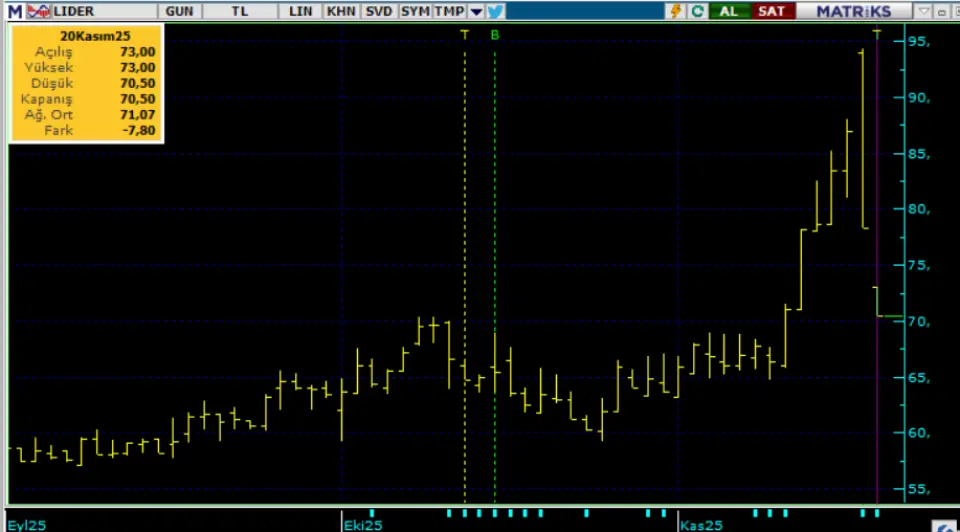 Hisse Taban Oldu Yasak Yedi! 2 Günde 94 TL den 70 TL ye Düştü! LIDER geçen hafta hızlı bir ralliye başlayarak bir anda 64 TL fiyatlardan 94,30 TL zirve fiyata kadar zıpladı. Hisse zirveyi gördüğü aynı gün taban oldu ve 78,30 TL taban fiyattan kapanış yaptı. Hissede açığa satış ve kredili işlemler de yasaklanınca hisse 70,50 TL fiyata kadar düşerek 2 günde %35 değer kaybetmiş oldu.