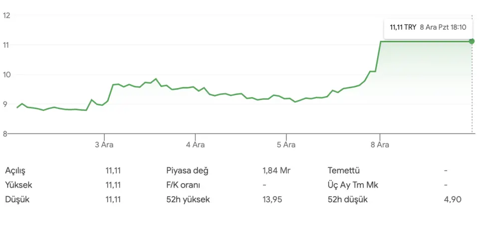8 Aralık 2025 tarihli işlem gününde BIST 100 endeksi, önceki kapanışa oranla 182,13 puan yükselirken, toplam işlem hacmi 148,3 milyar TL olarak karşımıza çıktı. Borsa'nın yükselişine eşlik eden hisselerden biri de MANAS ENERJİ YÖNETİMİ SANAYİ VE TİCARET A.Ş. (MANAS) oldu. Geçtiğimiz haftanın son işlem günü olan 5 Aralık 2025'i 10,10 TL'den noktalayan MANAS hissesi, dünkü seans açılışında saat 10.05 itibariyle 11,11 TL'ye yükseldi ve TAVAN oldu.