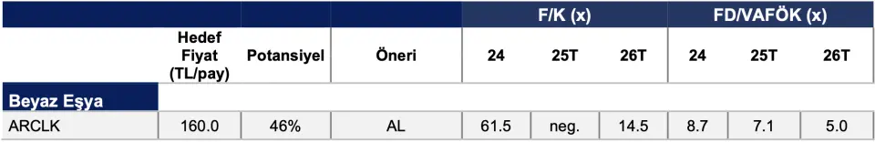 - "Ayrıca şirketlerle görüşmelerimiz ve finansal sonuçlar, Arçelik’in <ARCLK TI> iç pazarda payını arttırdığına ve sektör verilerinden pozitif ayrıştığına işaret ediyor. 2026’da iç talepte faiz indirimleri ve yüksek baz ekseninde yatay seyir bekliyoruz. İhracat tarafında, nihai talepte kısmi iyileşme beklense de, fiyatlama gücünün ise yoğun rekabet nedeniyle zayıf kalmaya devam edeceğini öngörüyoruz.