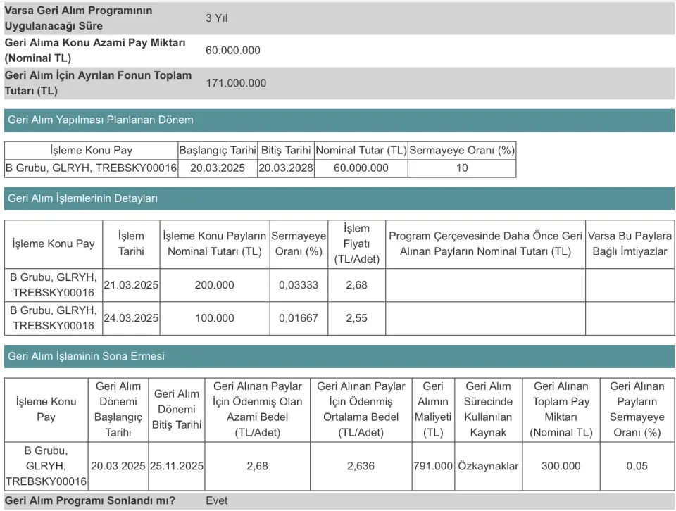 GLRYH Pay Geri Alım Programı Hakkında Resmi KAP Açıklaması
