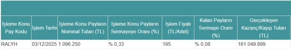 Yönetim Kurulumuz tarafından alınan 21.07.2023 tarihli payların geri alımına ilişkin karar kapsamında; Ral Yatırım Holding A.Ş. ("RALYH") sermayesinin %1,40'ını temsil eden toplam 4.662.901 TL nominal değerli RALYH payı şirketimizce geri alınmıştı. Pay geri alım programı dahilinde geri alınan 1.096.250 TL nominal değerdeki RALYH paylarının Borsa İstanbul'da satışı 03.12.2025 tarihinde pay başına 195 TL fiyatla gerçekleştirilmiştir. Satıştan elde edilen 213.768.750 TL şirketin büyüme planlarına yönelik işletme sermayesi ihtiyacının karşılanması amacıyla kullanılacaktır. Bu işlemle birlikte şirketimizin 03.12.2025 tarihi itibariyle RALYH sermayesinde 21.07.2023 tarihli payların geri alımına ilişkin karar kapsamında 277.901 TL nominal değerde geri alınan payı bulunmaktadır.