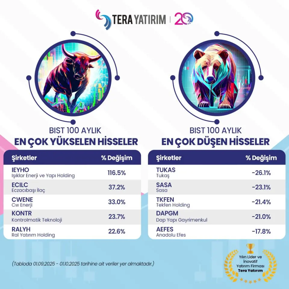 Aracı kurum sosyal medyadan yayımladığı açıklamada "BIST 100 Aylık en çok yükselen ve en çok düşen hisseleri takip ederek yatırım stratejinizi belirleyebilirsiniz. Tabloda 1 Eylül 2025 – 1 Ekim 2025 tarihlerine ait veriler yer almaktadır." ifadesine yer verildi.