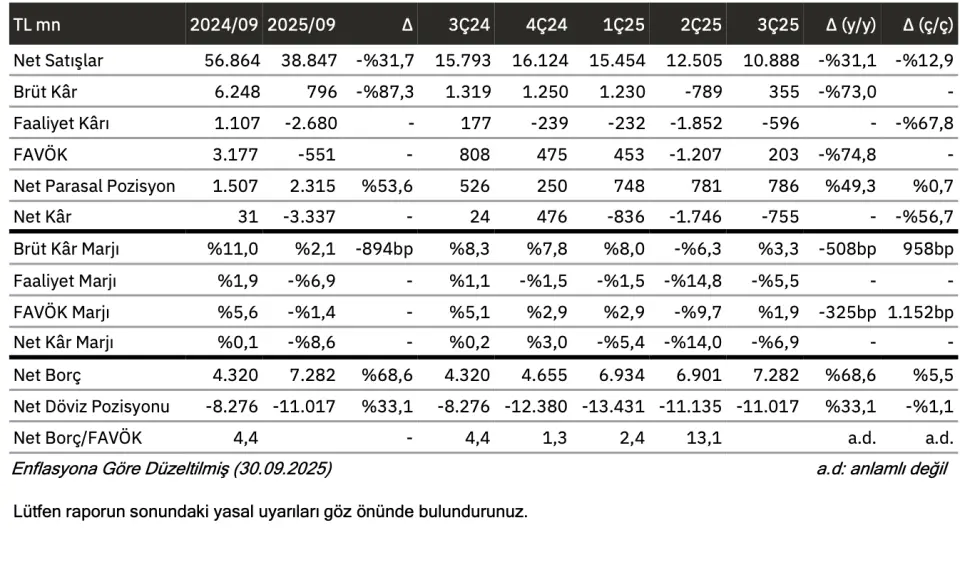 - "Net satışları 3. çeyrekte geçen yılın aynı çeyreğine göre %31,06 azalışla 10.888 milyon TL olmuştur. 2025 yılının ilk 9 ayında net satışları %31,68 azalışla 38.847 milyon TL seviyesinde gerçekleşmiştir."