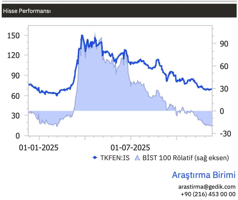 - "Tekfen İnşaat'in, 3Ç25 mali sonuçlarını 10 Aralık tarihine kadar açıklamak için düzenleyici kurumdan izin aldığını hatırlatmakta fayda görüyoruz. Genel olarak, sonuçları negatif olarak değerlendiriyoruz. Brüt kârdan net kâra kadar tüm kâr rakamları, temel olarak taahhüt segmentinin kötü performansı nedeniyle yıllık bazda daha olumsuzdur. 3Ç25'te yıllık bazda %75 düşüş göstererek 203 milyon TL olan FAVÖK, 9A25 rakamını 3.177 milyon TL'den -551 milyon TL'ye geriletmiştir."