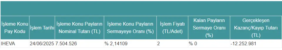 IHLAS toplam, 7.504.526 lot IHEVA hissesini ve 1.725.000 lot IHGZT hissesini satın aldığını duyurdu.