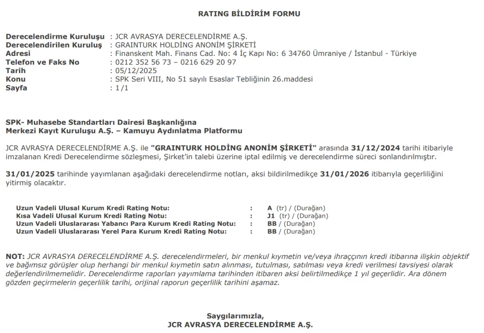 Grainturk Holding, JCR Avrasya ile Derecelendirme Sözleşmesini Sonlandırdı