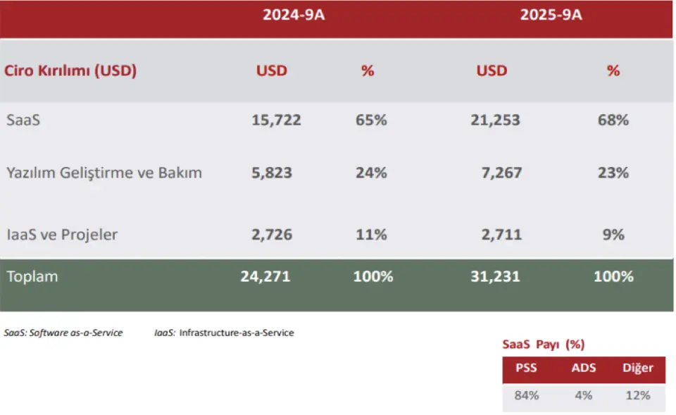 Yazılım geliştirme - bakım gelirler 5,823 milyon dolardan %25 artarak 7,267 milyon dolara yükselmiş, burada da artış sözleşme kapsam genişlemeleri ve ek geliştirme taleplerinden oluyor. IaaS ve proje gelirleri, 2,726 milyon dolardan %1 düşüşle 2,711 milyon dolara gerilemiş; bu düşüşün sebebi önceki yıllarda yapılan kurulumların normal akışa dönmesi ve yeni büyük ölçekli proje sayısının sınırlı kalmasıdır.