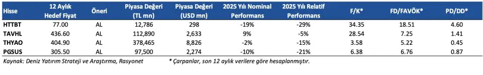 Borsa aracı kurumlarından Deniz Yatırım, havacılık sektörüne yönelik değerlendirmesini yatırımcılara sundu. Deniz Yatırım HTTBT, TAVHL, THYAO ve PGSUS hisseleri için hedef fiyat ve hisse tavsiyesini paylaştı.