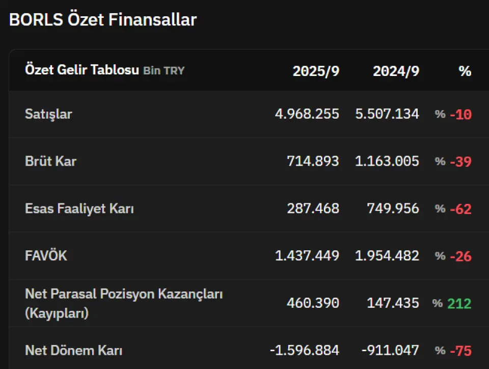 En son açıklanan 2025 ylı 9 aylık bilançosunda BORLS dev bir zarar rakamı açıkladı. 2024 yılı 9 aylık bilançoda 911.047.000 TL zarar açıklamış olan şirket 2025 yılı 9 aylıkta bu zarar rakamını %75 oranında artırdı ve 1.596.884.000 TL zarar açıkladı. Şirketin 2025 yılı yıllık bilançosu henüz açıklanmadı.