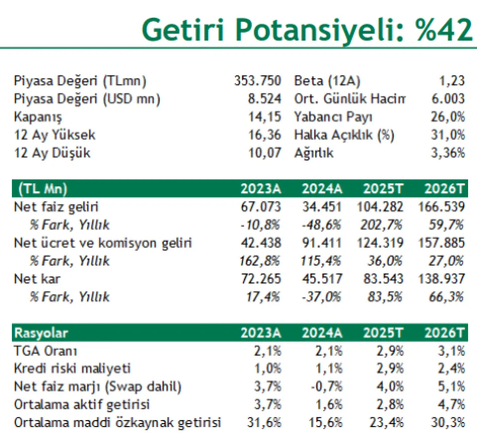 Bankanın net karını 2025 yıl sonunda yıllık bazda %83 artış göstermesini bekliyoruz. İş Bankası için 12 aylık hedef fiyatımız 20,07 TL olarak belirlerken, bu hedef %33 artış potansiyeli bulunduruyor. Banka için “AL” tavsiyemizi koruyoruz. Banka payları 2025T 4,5 F/K ve 0,95 F/DD çarpanlarıyla ve %23,4 ortalama özkaynak karlılığıyla işlem görüyor.