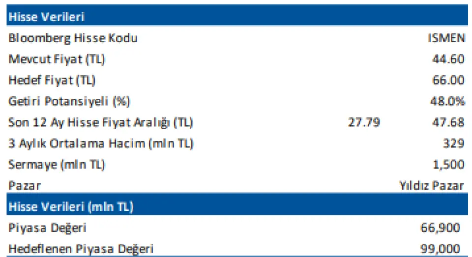 Deniz Yatırım hisseye daha önce 66 TL hedef fiyat açıklamıştı. Kurum hedef fiyatını güncelledi ve 64,40 TL ye çekti. ISMEN borsada 40 TL civarı fiyattan işlem görüyor.