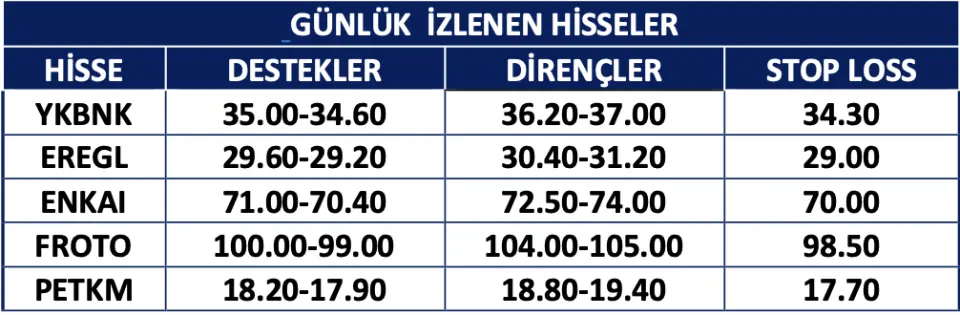 Meksa Yatırım'ın günlük hisse senedi öneri listesi yatırımcılara sunuldu. Hisse önerileri listesinde yer alan hisselere ilişkin destek ve dirençlerle beraber stop loss seviyelerine de yer verildi. Bu hisseler yatırımcılar tarafından gün boyu izlenecek. Hisseler şu şekilde: YKBNK, EREGL, ENKAI, FROTO ve PETKM.