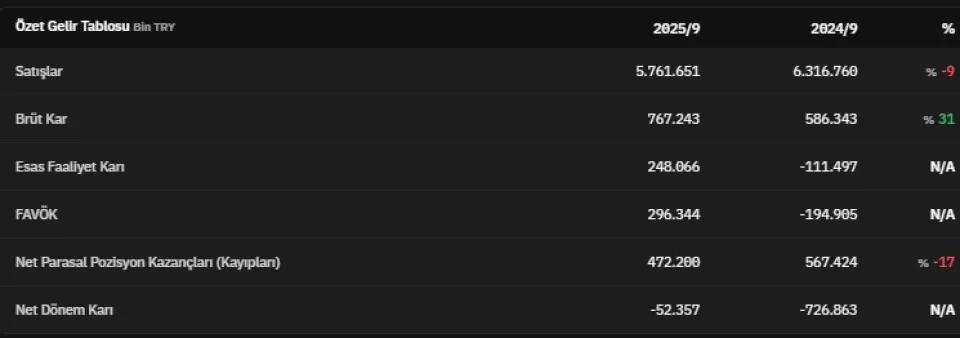 FAVÖK 2025 yılının üçüncü çeyreğinde 296.344.000 TL olarak açıklandı. Net parasal pozisyon kazançları 2025 yılının üçüncü çeyreğinde 472.200.000 TL olarak kaydedildi. Net dönem kârı ise -52.357.000 TL olarak kaydedildi. İlgili veri 2024 yılının üçüncü çeyreğinde -726.863.000 TL olarak açıklanmıştı.