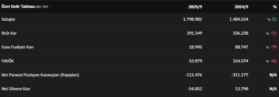 FAVÖK 2025 yılının üçüncü çeyreğinde 53.079.000 TL olarak açıklandı. Net parasal pozisyon kazançları 2025 yılının üçüncü çeyreğinde -112.476.000 TL olarak kaydedildi. Net dönem kârı ise -54.852.000 TL olarak kaydedildi.