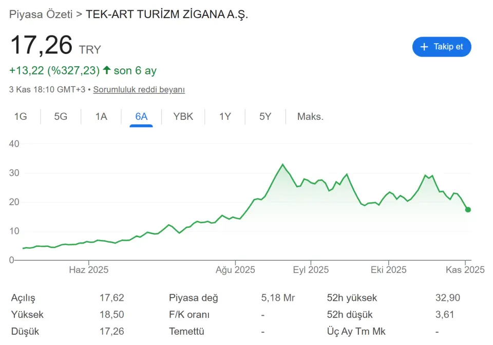 3 Kasım 2025 tarihinde birçok hisseye tedbir kararı getirildi. Bu hisselerden biri de TEK-ART TURİZM ZİGANA A.Ş. (TEKTU) şirketi oldu. Bu  hisse için Semaye Piyasası Kurulu kararı uyarınca devreye alınan volatilite bazlı tedbir sistemi kapsamında bir aylık tedbir kararı alındı. Paylar 4 Kasım 2025 tarihli işlemlerden seans başından 3 Aralık 2025 tarihli işlemlere yani seans sonuna kadar brüt takas tedbiri uygulanacaktır.