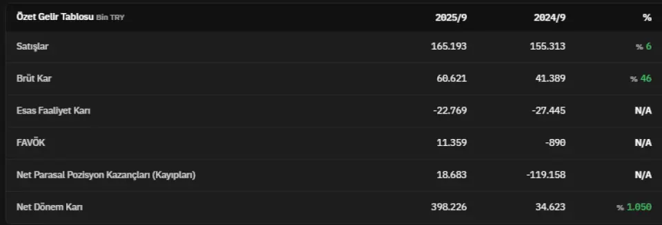 FAVÖK 2025 yılının üçüncü çeyreğinde 11.359.000 TL olarak açıklandı. Net parasal pozisyon kazançları 2025 yılının üçüncü çeyreğinde 18.683.000 TL olarak kaydedildi. Net dönem kârı ise 398.226.000 TL olarak kaydedildi. İlgili veri 2024 yılının üçüncü çeyreğinde 34.623.000 TL olarak açıklanmıştı. Böylece net dönem karı %1.050 artmış oldu.