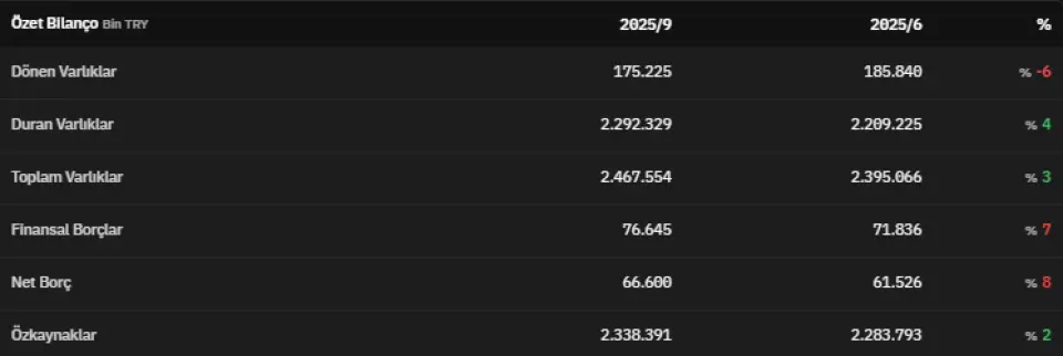 Dönen varlıklar 2025 yılının üçüncü çeyreğinde 175.225.000 TL olmuştur. 2025 yılının üçüncü çeyreğinde 2.292.329.000 TL olarak açıklanan duran varlıklar, 2025 yılının ikinci çeyreğinde 2.209.225.000 TL olarak açıklanmıştı. Toplam varlıklar üçüncü çeyrekte 2.467.554.000 TL olarak kaydedildi. Finansal borçlar 2025 yılının üçüncü çeyreğinde 76.645.000 TL olarak kaydedildi. 2025 yılının ikinci çeyreğinde 71.836.000 TL olarak açıklanan finansal borçlar, üçüncü çeyrekte %7 artmış oldu.