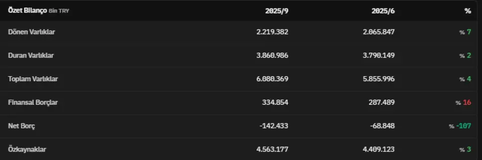 Dönen varlıklar 2025 yılının üçüncü çeyreğinde 2.219.382.000 TL olmuştur. 2025 yılının üçüncü çeyreğinde 3.860.986.000 TL olarak açıklanan duran varlıklar, 2025 yılının ikinci çeyreğinde 3.790.149.000 TL olarak açıklanmıştı. Toplam varlıklar üçüncü çeyrekte 6.080.369.000 TL olarak kaydedildi. Finansal borçlar 2025 yılının üçüncü çeyreğinde 334.854.000 TL olarak kaydedildi.2025 yılının üçüncü çeyreğinde net borç -142.433.000 TL olarak açıklandı. 2025 yılının ikinci çeyreğinde -68.848.000 TL olarak açıklanan net borç, 3. çeyrekte %107 azalmış oldu. Özkaynaklar 2025 yılının üçüncü çeyreğinde 4.563.177.000 TL olarak açıklandı. İlgili veri 2025 yılının ikinci çeyreğinde 4.409.123.000 TL olarak açıklanmıştı. Böylece ilgili veri %3 arttı.
