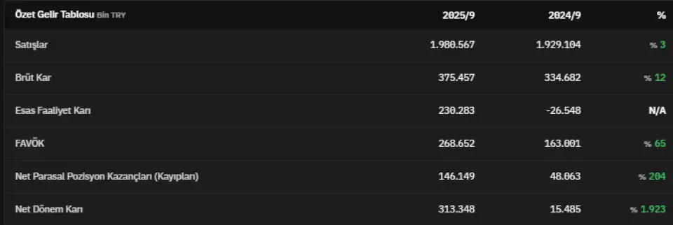 FAVÖK 2025 yılının üçüncü çeyreğinde 268.652.000 TL olarak açıklandı. 2024 yılının üçüncü çeyreğinde 163.001.000 TL olarak açıklanan FAVÖK, 3. çeyrekte %65 artmış oldu. Net parasal pozisyon kazançları 2025 yılının üçüncü çeyreğinde 146.149.000 TL olarak kaydedildi. Net dönem kârı ise 313.348.000 TL olarak kaydedildi. İlgili veri 2024 yılının üçüncü çeyreğinde 15.485.000 TL olarak açıklanmıştı. Böylece ilgili veri %1.923 artmış oldu.