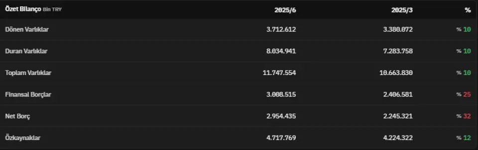 Dönen varlıklar 2025 yılının ikinci çeyreğinde 3.712.612.000 TL olmuştur. 2025 yılının ilk çeyreğinde 3.380.072.000 TL olarak açıklanan dönen varlıklar, 2025 yılının ikinci çeyreğinde %10 artmış oldu. Duran varlıklar 2025 yılının ikinci çeyreğinde 8.034.941.000 TL olarak açıklanmıştı.Finansal borçlar 2025 yılının ikinci çeyreğinde 3.008.515.000 TL olarak açıklandı. 2025 yılının ikinci çeyreğinde net borç 2.954.435.000 TL olarak açıklandı. Özkaynaklar 2025 yılının ikinci çeyreğinde 4.717.769.000 TL olarak kayıtlara geçti.