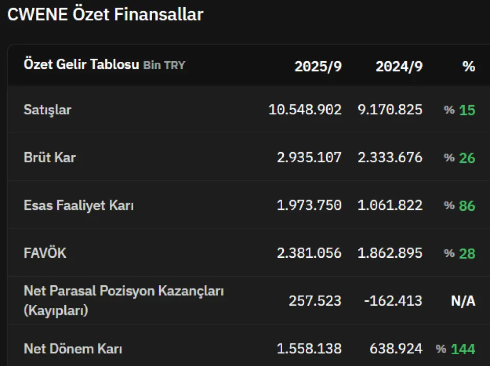 CWENE den güzel haberler ardı ardına gelmeye devam ediyor. Şirket 3. çeyrek bilançosunda kar oranını geçen yılın aynı dönemine göre %144 artırarak 1.558.138.000 TL kar rakamı açıkladı. Şirketin geçen yıl 3. çeyrek karı 638.924.000 TL olmuştu.