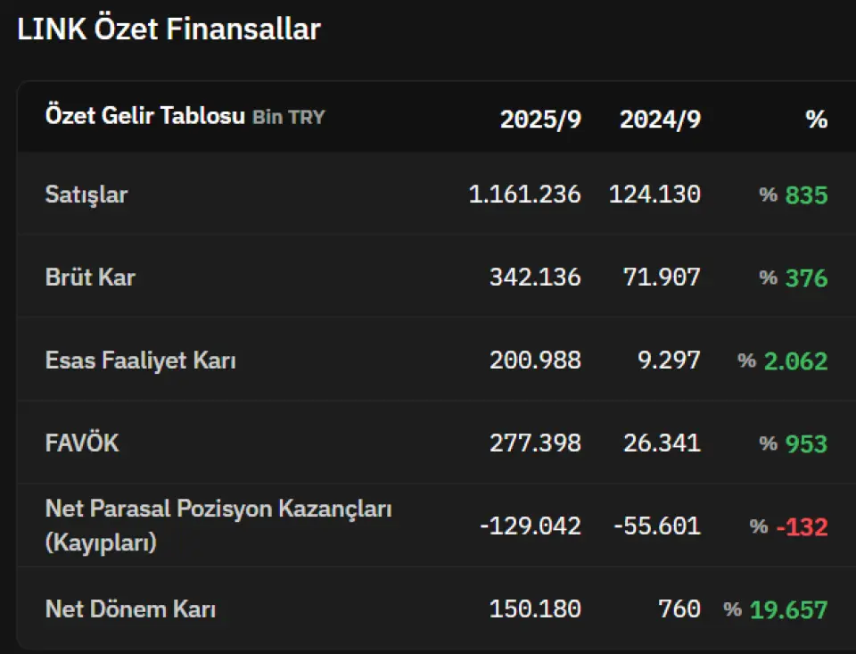 Link Bilgisayar LINK bu yıl 3. çeyrek bilançosunda yıldız gibi parlamıştı. Şirket geçen yıl 3. çeyrekte 760.000 TL kar açıklamıştı. Bu yıl 3. çeyrekte şirket karı tam %19657 oranında artarak 150.180.000 TL kar rakamı açıklandı.