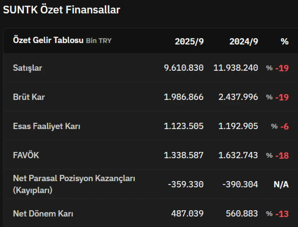 SUNTK geçen yıl 3. çeyrek bilançosunda 560.883.0000 TL kar açıklamıştı. Şirket bu yıl 3. çeyrek bilançosunda kar oranını %13 düşürerek 487.039.000 TL kar açıkladı.