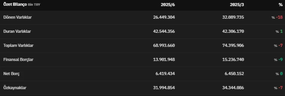 Dönen varlıklar 2025 yılının ikinci çeyreğinde 26.449.304.000 TL olarak açıklandı. 2025 yılının ikinci çeyreğinde 42.544.356.000 TL olarak açıklanan duran varlıklar ise, 2025 yılının ilk çeyreğinde 42.306.170.000 TL olarak açıklanmıştı. Toplam varlıklar 2025 yılının ikinci çeyreğinde 68.993.660.000 TL olarak kaydedildi. 2025 yılının ilk çeyreğinde 74.395.906.000 TL olarak açıklanan toplam varlıklar, 2025 yılının ikinci çeyreğinde %7 azalmış oldu.Finansal borçlar 2025 yılının ikinci çeyreğinde 13.901.948.000 TL olarak açıklandı. 2025 yılının ilk çeyreğinde 15.236.740.000 TL olarak açıklanan finansal borçlar, 2025 yılının ikinci çeyreğinde %9 azalmış oldu. 2025 yılının ikinci çeyreğinde net borç 6.419.434.000 TL olarak açıklandı. Özkaynaklar ise 2025 yılının ikinci çeyreğinde 31.994.854.000 TL olarak duyuruldu. 2025 yılının ilk çeyreğinde 34.344.086.000 TL olarak açıklanan özkaynaklar, 2025 yılının ikinci çeyreğinde %7 azalmış oldu.