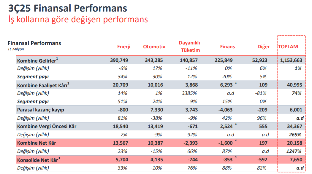2025 yılı üçüncü çeyreğinde toplam kombine gelirlerini yıllık bazda %1 artışla 1,15 trilyon TL seviyesinde gerçekleştirdi. Segmentler bazında bakıldığında, enerji grubu yüksek kapasite kullanımı ve operasyonel verimlilikle %14 artış kaydeden faaliyet karı sayesinde konsolide sonuçlara en güçlü katkıyı verdi. Otomotiv segmentinde gelirler %17 artarken, artan elektrikli araç payı ve fiyat rekabeti faaliyet karlılığındaki artışı sınırladı.
